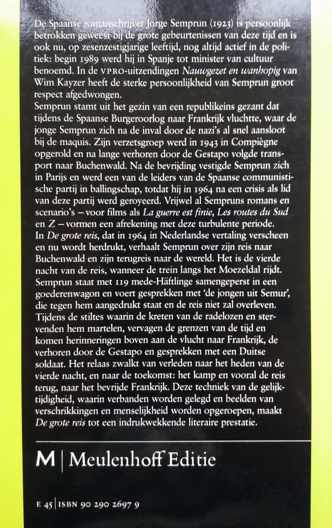 (Meulenhoff - Amsterdam) ISBN 9029026979 3e druk 1990 191 pp paperback (rug iets scheef, verder goed!) Staat van het boek: 7.5-8.0 De grote reis (1964) beschrijft de lange, vierde nacht van een reis die voert van het Franse Compiègne naar het concentratiekamp Buchenwald. Met honderdnegentien medegevangenen staat de hoofdpersoon samengeperst in een goederenwagon. Hij voert diepgaande gesprekken met 'de jongen uit Semur', die tegen hem aangedrukt staat en die het transport niet zal overleven. Tijdens de lange, tergende stiltes komen herinneringen boven aan de vlucht van Frankrijk en de verhoren door de Gestapo. Van het verleden springt het relaas naar de toekomst: het kamp en vooral de reis terug naar het bevrijde Frankrijk. Deze techniek an gelijktijdigheid maakt De grote reis tot een indrukwekkende literaire prestatie.Recensie(s)Dit is de eerste, autobiografische, in het Frans geschreven roman van de Spaanse schrijver Jorge Semprún, die in ons land bekend is geworden dank zij de VPRO-serie 'Nauwgezet en wanhopig'. Uitgangspunt van het verhaal is de laatste nacht die de ik-figuur - een Spaanse jongeman die in het Franse verzet zit - doorbrengt in de trein die hem naar een Duits concentratiekamp zal brengen. Hij kan er zestien jaar later pas voor het eerst op terugkijken. Door dit perspectief kunnen niet alleen de gebeurtenissen tijdens de reis en de omstandigheden die tot de aanhouding door de Duitsers hebben geleid, aan de orde komen, maar ook de verwarrende, vervreemdende tijd onmiddellijk na de bevrijding uit het kamp. Veelzeggend is dat de kampervaringen zelf zo goed als onbesproken blijven. Toch wordt er op indirecte wijze veel indringends over de periode in het kamp gezegd, meer dan in veel romans die veel explicieter zijn in hun beschrijvingen van de verschrikkingen. Een indrukwekkend verhaal van een sterke geest. Zeer kleine druk. (Biblion recensie, M. Steenmeijer.) Prijs €4,50 |