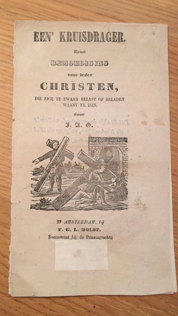 | Titel: | Een' Kruisdrager. Eene bemoediging voor ieder Christen, die zich te zwaar belast of beladen waant te zijn door J.A.O. Te Amsterdam bij F.G.L. Holst, Rozenstraat bij de Prinsengracht, 8 pp. |