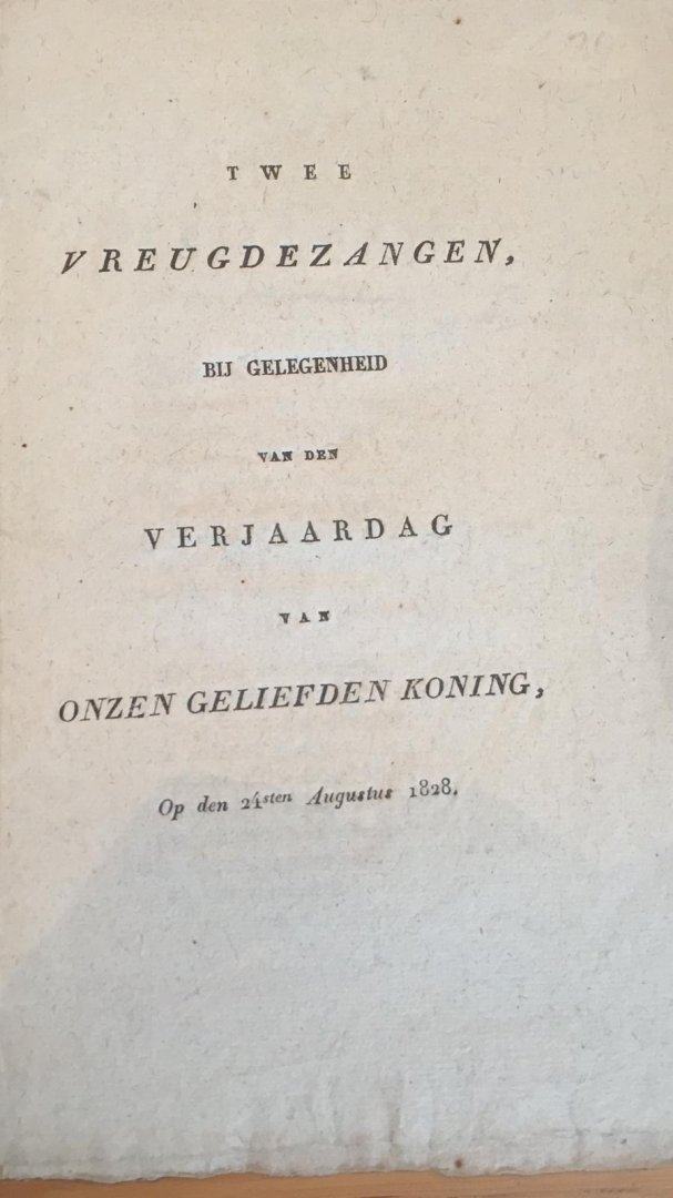 | Titel: | Twee vreugdezangen bij gelegenheid van den Verjaardag van onzen geliefden koning, Op den 24sten Augustus 1828, 7 pp. |