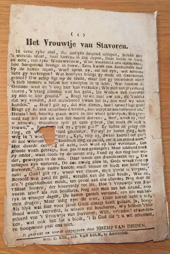 | Bijzonderheden: | 4 pages with songtexts: De oudste een Weduwvrouw met zes kinderen.... Wijs: een ieder mag in deze tijden. At the back: Het vrouwtje van Stavoren, gedrukt en uitgegeven door Josehp van Dieden, wed. C. Kok, geb Van Kolm, te Amsterdam. |