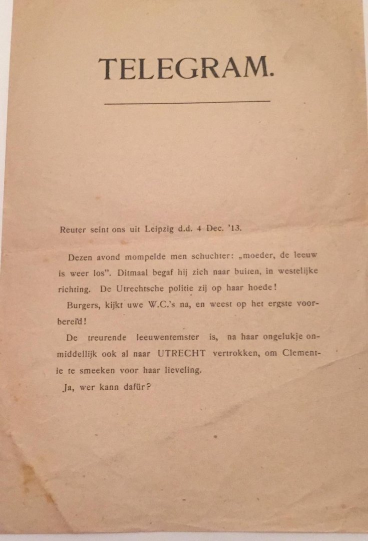| Titel: | Pamphlet. TELEGRAM. Reuter seint ons uit Leipzig d.d. 4 dec '13. Dezen avond mompelde men schuchter: " moeder, de leeuw is weer los". Ditmaal begaf hij zich naar buiten in westlijke richting. De Utrechtse politie zij op haar hoede! Burgers, ki... |