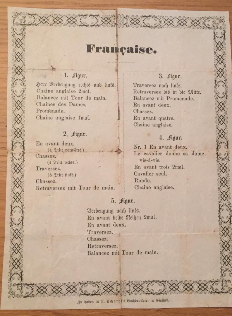 | Titel: | Pamphlet in French and German. 1. Figur Herr Berbeugun rechts und links. Chaine anglaise 2mal, Balancez mit Tour de main. Chaines des Dames. Promenade. Chaine Anglaise 1mal. 1 page Zu haben in M. Scharpf's Buchdruckerei im Mund. |