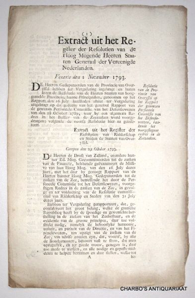 | Titel: | Extract uit het register der resolutien van de Hoog Mogende Heeren Staaten Generaal der Vereenigde Nederlanden. Veneris den 1 November 1793. Resolutie van de provincie van Overyssel op het rapport der geweezen Personeele Commissie van het Defe... |