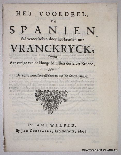 | Titel: | Het voordeel, dat Spanjen sal veroorsaeken door het breeken met Vranckryck, vertoont aen eenige van de hooge ministers der selver Kroone, met de korte noodsaekelijkheden uyt de staets-kunde. |
