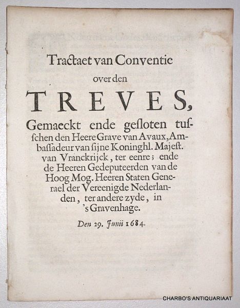 Titel: Tractaet van conventie over den Treves, gemaeckt en ghesloten tusschen den Heere Grave van Avaux, ambassadeur van Syne Koninghl. Majesteyt van Vranckrijck, ter eenre, ende de Heeren Gedeputeerden van de Hoog Mog. Heeren Staten Generael der Ver...