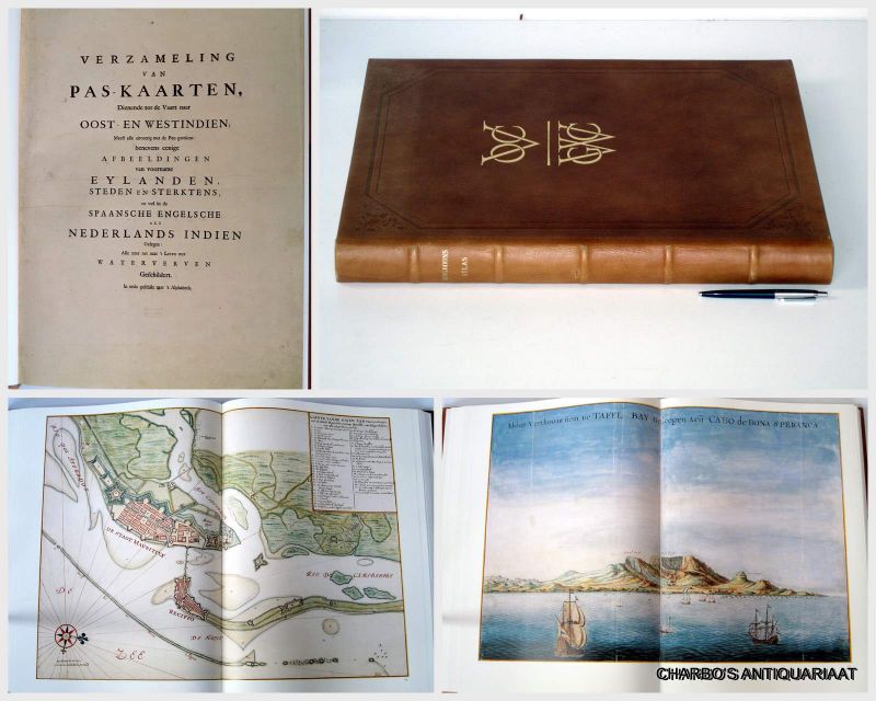 Hardcover. Or. brown leather with gilt monograms of VOC & WIC on front. (Small damage to rear cover, else fine). * 1000 numbered copies printed. - The atlas contains 107 splendid, for the greater part double page reproductions of maps and views, obtained from returned VOC and WIC ships, painted and printed by Johannes Vingboons in the 1650's and 60's, and never published before. - Incl. loosely inserted booklet: Ten geleide en beschrijving van de opgenomen kaarten door J. van Bracht. Achttiende-eeuws register. - Heavy item, requires extra shipping costs for destinations outside EU.