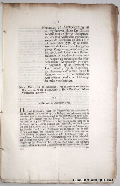 Zonder omslag. Goed ex. (Vertikale vouw door het midden). * Bevat 3 extracten uit de resolutien van de Staaten van Holland en West-Frieslandt van 6 & 11 nov. 1778, 2 protesten van Gedeputeerden van Amsterdam & een extract uit de resolutien van de Vroedschap van Amsterdam van 17 nov. (door de secretaris A. van Slingelandt). - Ref.: Cat. Kloosterboer 2302; Petit 6986 (andere ed.).