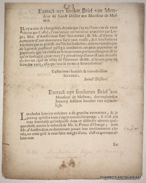 | Titel: | Extract uyt seecker brief van monsieur de Sainct Disdier aen monsieur de Mesmes. + Extract uyt seeckeren brief aen M. de Mesmes, 9 Jan. 1684 + Extract uyt seecker Brief van Pere Limojon, aen le reverend Pere Grenier, tot Marseille, a la Haye ... |