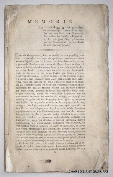 BATAAFSCHE REPUBLIEK. - Memorie ter wederlegging der gronden en redeneeringen, vervat in de missive van den Raad van Binnenlandsche zaaken der Bataafsche Republiek, op den 10den Juny 1803, geschreeven aan het Staatsbewind, en betreffende de zaak der Heerlykheden.