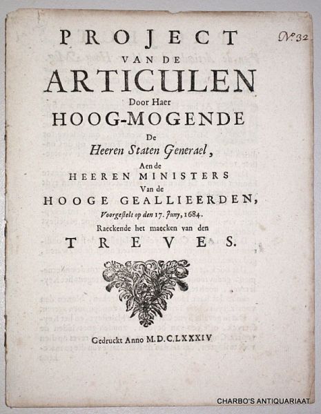 | Titel: | Project van de articulen door Haer Hoog-Mogende de Heeren Staten Generael, aen de Heeren Ministers vande Hooge Geallieerden, voorgestelt op den 17. Juny, 1684, raeckende het maecken van den Treves. |
