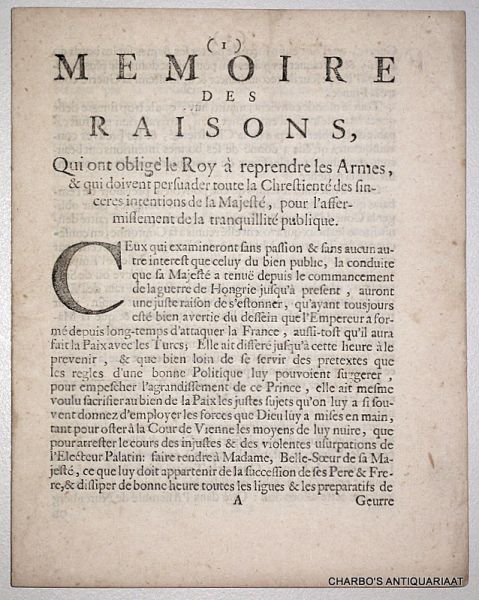 | Titel: | Memoire des raisons qui ont oblige le Roy à reprendre les armes, & qui doivent persuader toute la Chrestienté des sinceres intentions de sa Majesté pour l'affermissement de la tranquillité publique. (Fait a Versailles, 24 jour de Septembre 168... |