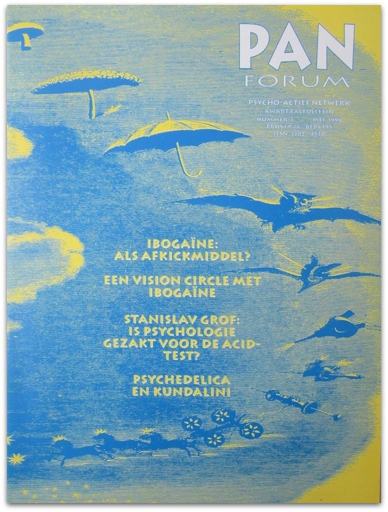¶ Aflevering 3 (Mei 1996) bevat bijdragen van/over: Eric Fromberg (Ibogaïne van Tabernanthe iboga, een struik uit Afrika), Atmo Yatra (Een Peruviaans ayahuasca-ritueel in Nederland), Donald J. DeGarcia (over het opwekken van Kundalini) en Jerry Snider (Interview met Stanislav Grof). Zeldzaam tijdschrift. Tussen oktober 1995 en oktober 1998 verschenen tien nummers; in mei 1995 verscheen een 0-nummer. |