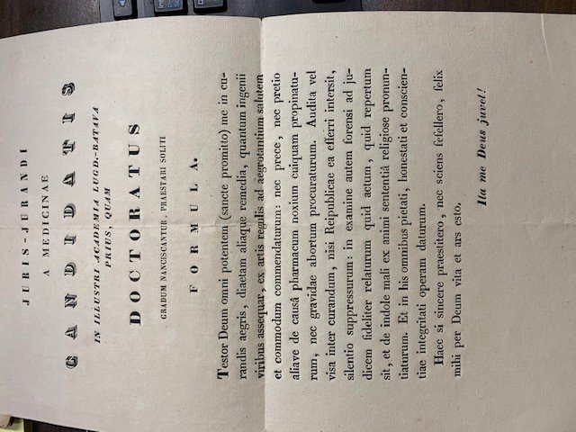 Juris-Jurandi a Medicinae Candidatis in illustri Academia Lugd. Batava prius, quam Doctoratus gradum nanciscantur, praesteri soliti Formula. One page printed text, no date, 18/19th century? formula of the oath to be repeated by medicine students prior to becoming doctor of medicine at Leiden University. The first sentence is similar to the oath of Hippocrates, the second concerns the professional secrecy.