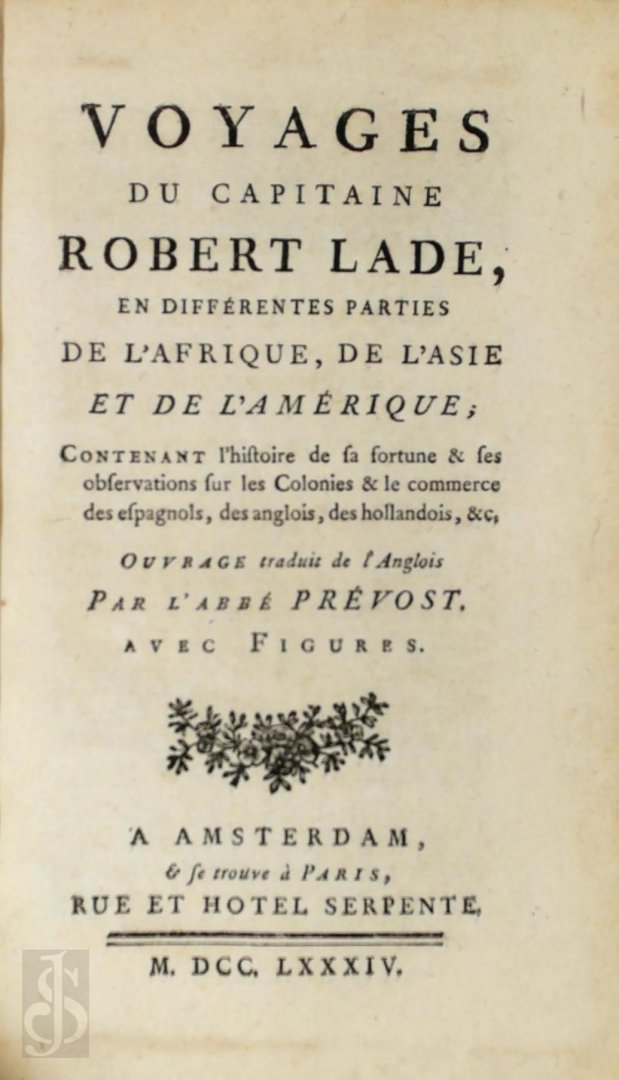 Second edition (first ed. 1744) of this fictional account of travels through Africa, Asia and the Americas. It was presented as a translation by Abbé Prévost from the English, but there is no English edition known. It was considered an authoritative source for two centuries, with Buffon, d'Alembert and Jules Verne all quoting from the book, until it was proved to be a pastiche in 1939. Despite Robert Lade being a fictional character, Prévost wrote a reliable travel account based on numerous genuine sources.