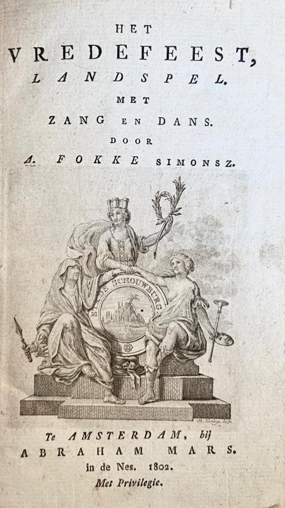| Titel: | Het Vredefeest, landspel met zang en dans door A. Fokke Simonsz., Te Amsterdam bij Abraham Mars 1802, 43 pp. RARE FIRST EDITION. |