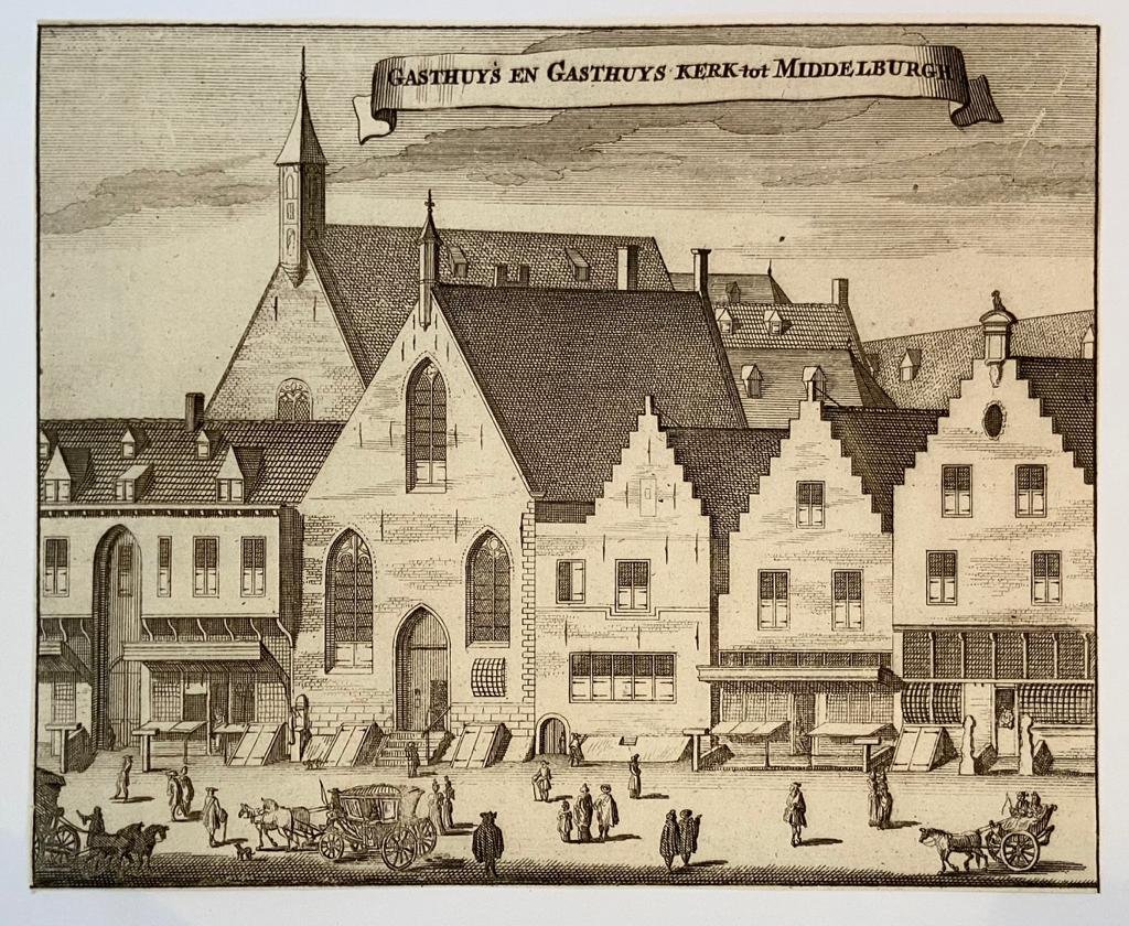 | Titel: | Print/Prent: Gasthuys en Gasthuys Kerk tot Middelburgh (Middelburg), ca 1696. |