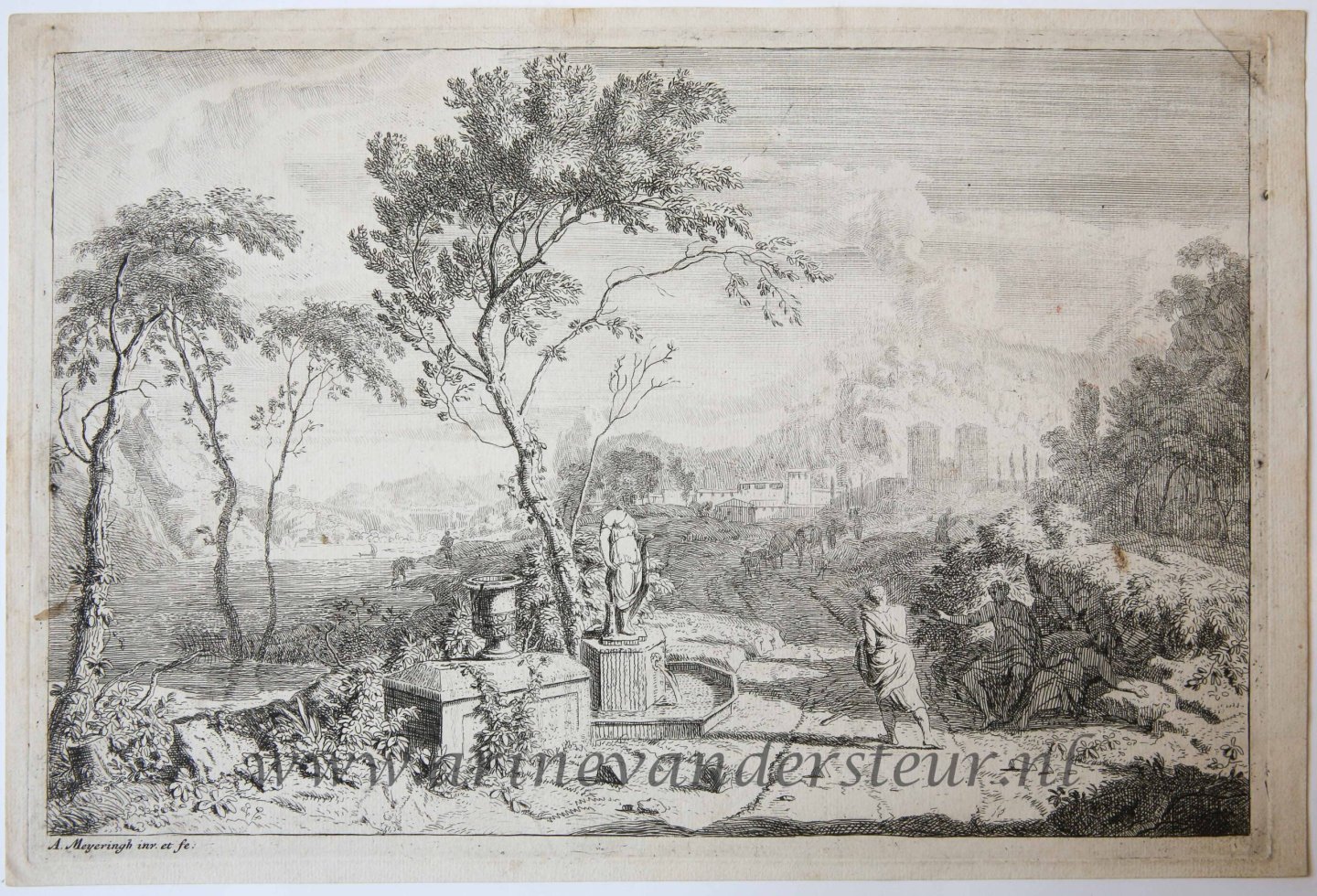 | Bijzonderheden: | A landscape with a fountain and a statue without the head. A man walks towards the statue on the road. A seated man and a reclining woman along the way.Signed on the bottom left: 'A: Meyeringh Inv. et Fecit'.From a set of various italianate landsc... |