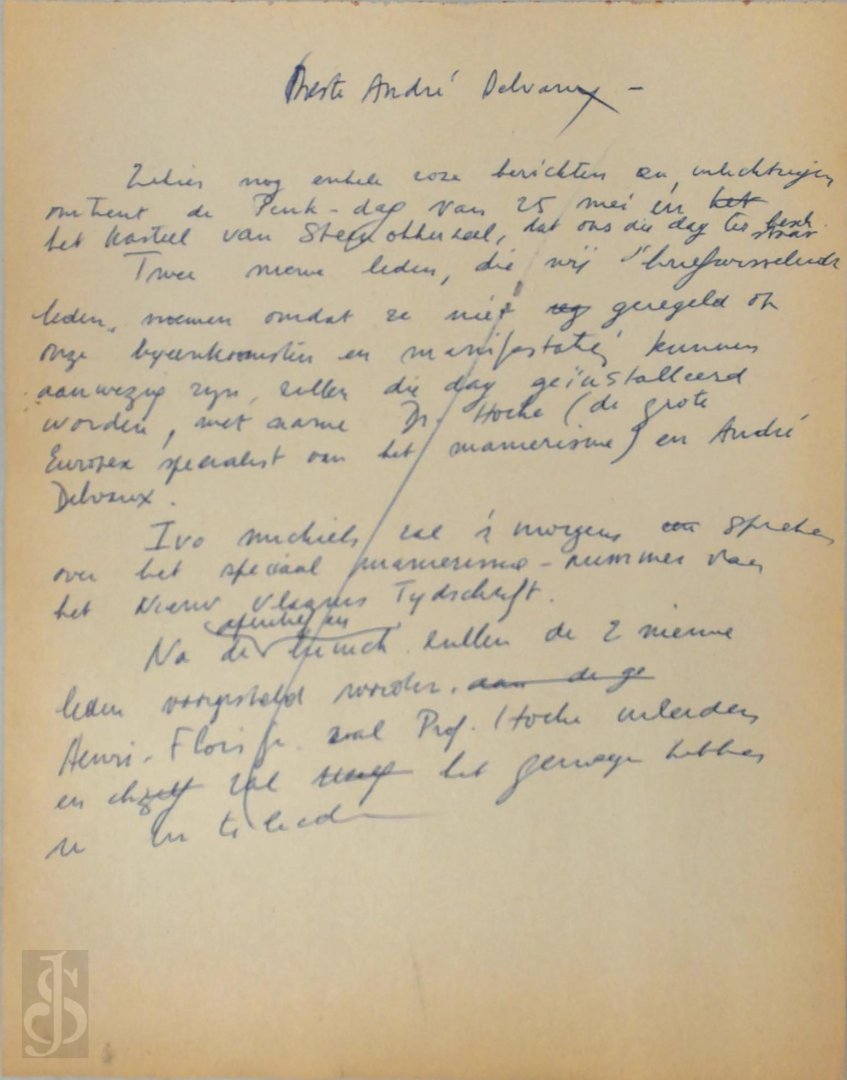 Handgeschreven klad voor brief van Conrad aan Delvaux m.b.t de inauguratie van Delvaux als briefwisselend lid van de Pink Poets op 25 mei in het kasteel van Hamme te Steenokkerzeel.\n1 p., zwarte inkt - (Volledige tekst doorgehaald met één haal)\nInteressante tekst over o.a. de status van 'briefwisselend lid' van de Pink Poets\nCitaat: \"Ziehier enkele berichten en inlichtingen omtrent de Pink-dag van 25 mei [...] Twee nieuwe leden, die wij 'briefwisselende leden' noemen omdat ze niet geregeld op onze bijeenkomsten en manifestaties kunnen aanwezig zijn, [...] met name Dr. Hocke (de grote Europese specialist van het maniërisme) en André Delvaux. Ivo Michiels zal 's morgens spreken over het speciaal maniërisme-nummer van het Nieuw Vlaams Tijdschrift.\"