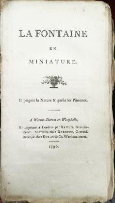 À Warum-Darum en Westphalie, & Londen, Baylis, Deboffe and Dulau & Co., 1796. 17 x 10 cm. Versleten oud omslag, rug ligt bloot. (4), 180 p. Niet afgesneden. Omslag flink versleten. Het boekblok in goede staat. Fabels en fragmenten van Jean de La Fontaine. Wat een merkwaardige plek: Warum-Darum in Westfalen. Blijkens commentaren in dichtvorm achterin het boek lag deze pseudonieme plaats op de samenvloeiing van Lippe en Ahse, met andere woorden: het was de stad Hamm, in 1796 een centrum van vluchtelingen uit Frankrijk, van wie de onbekend gebleven uitgever-redacteur van dit boek er een was (tezaam met de latere koningen van Frankrijk, de gebroeders Louis XVIII en Charles X. Zeldzaam: slechts één in Worldcat (Oxford), en een mysterie!