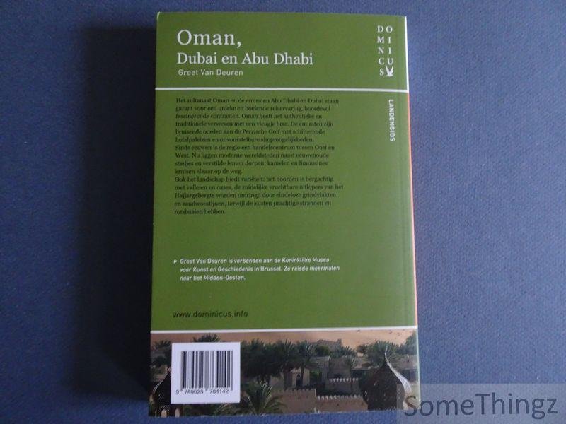 Het sultanaat Oman en de emiraten Abu Dhabi en Dubai staan garant voor een unieke en boeiende reiservaring, boordevol fascinerende contrasten. Oman heeft het authentieke en traditionele verweven met een vleugje luxe. De emiraten zijn bruisende oorden aan de Perzische Golf met schitterende hotelpaleizen en onvoorstelbare shopmogelijkheden. Sinds eeuwen is de regio een handelscentrum tussen Oost en West. Nu liggen moderne wereldsteden naast eeuwenoude stadjes en verstilde lemen dorpen; kamelen en limousines kruisen elkaar op de weg. Ook het landschap biedt variëteit: het noorden is bergachtig met valleien en oases, de zuidelijke vruchtbare uitlopers van het Hajjargebergte worden omringd door eindeloze grindvlakten en zandwoestijnen, terwijl de kusten prachtige stranden en rotsbaaien hebben. Greet Van Deuren is verbonden aan de Koninklijke Musea voor Kunst en geschiedenis in Brussel. Ze reisde meermalen naar het Midden-Oosten.