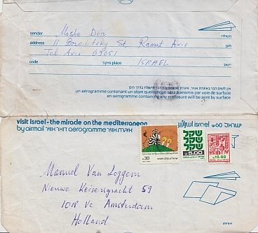 Luchtpostpapier met afzender en geadresseerde plus drie postzegels op de voorzijde, vriendelijke brief (in het Engels) op de achterzijde (16 regels). 27 x 20 cm. Gedateerd 'March 10, 1985'. Iets gekreukt en licht beschadigd. Over het ter vertaling aanbieden van Van Loggem's roman over Mozes bij een Israëlische uitgeverij, maar het mocht niet baten: 'Your Moses is not their Moses'. Moshe Dor (1932-2016) had in 1985 Nederland bezocht, wat resulteerde in de vertaling van enkele van zijn gedichten in het Nederlands. Hij had veel Nederlandse schrijvers ontmoet, onder wie Van Loggem (1916-1998).