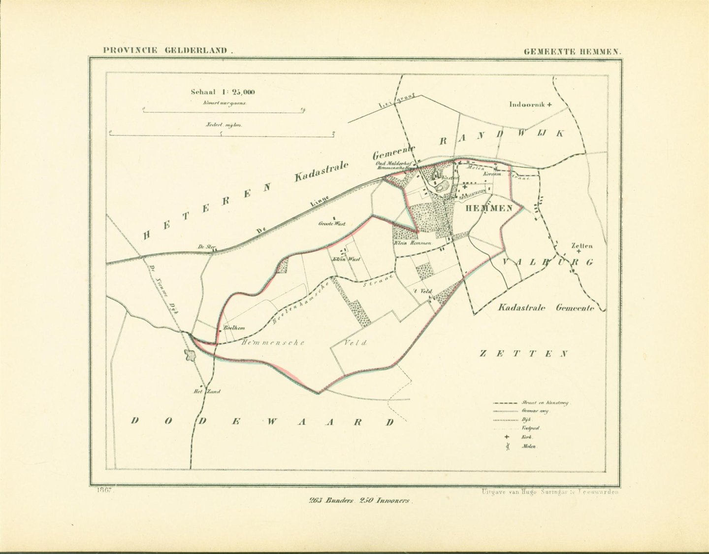 Map Kuyper Gemeente atlas van GELDERLAND This is an original map taken from an incomplete copy of the Gemeente Atlas van GELDERLAND by Jacob Kuyper ( 1821 – 1908). Issued in 1867 by Surringa Leeuwarden. All maps were printed in black. The outline border of the Municipality were coloured by hand. De Gemeente Atlas van Nederland verscheen ca. 1868 en werd uitgegeven door Hugo Suringar te Leeuwarden. Voor iedere provincie een deel. Het bevat de kaarten van alle Nederlandse gemeenten. De kaarten werden in zwart/wit gedrukt waarbij de gemeentegrenzen met de hand waren ingekleurd. De tekenaar van de kaarten, Jacob Kuyper (1821-1908) was een belangrijke pionier op het gebied van de thematische cartografie en medeoprichter van het Koninklijk Nederlands Aardrijkskundig Genootschap (KNAG). Hij stelde in de periode 1857-1880 verschillende atlassen samen. De bekendste atlas was de Gemeente-Atlas van Nederland. De kaarten voor deze atlas tekende Kuyper in de jaren 1865-1870