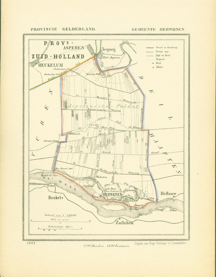 Map Kuyper Gemeente atlas van GELDERLAND This is an original map taken from an incomplete copy of the Gemeente Atlas van GELDERLAND by Jacob Kuyper ( 1821 – 1908). Issued in 1867 by Surringa Leeuwarden. All maps were printed in black. The outline border of the Municipality were coloured by hand. De Gemeente Atlas van Nederland verscheen ca. 1868 en werd uitgegeven door Hugo Suringar te Leeuwarden. Voor iedere provincie een deel. Het bevat de kaarten van alle Nederlandse gemeenten. De kaarten werden in zwart/wit gedrukt waarbij de gemeentegrenzen met de hand waren ingekleurd. De tekenaar van de kaarten, Jacob Kuyper (1821-1908) was een belangrijke pionier op het gebied van de thematische cartografie en medeoprichter van het Koninklijk Nederlands Aardrijkskundig Genootschap (KNAG). Hij stelde in de periode 1857-1880 verschillende atlassen samen. De bekendste atlas was de Gemeente-Atlas van Nederland. De kaarten voor deze atlas tekende Kuyper in de jaren 1865-1870