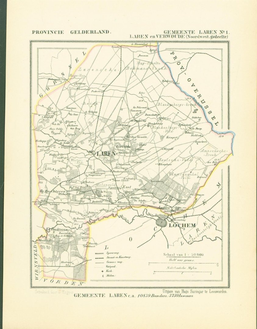 Map Kuyper Gemeente atlas van GELDERLAND This is an original map taken from an incomplete copy of the Gemeente Atlas van GELDERLAND by Jacob Kuyper ( 1821 – 1908). Issued in 1867 by Surringa Leeuwarden. All maps were printed in black. The outline border of the Municipality were coloured by hand. De Gemeente Atlas van Nederland verscheen ca. 1868 en werd uitgegeven door Hugo Suringar te Leeuwarden. Voor iedere provincie een deel. Het bevat de kaarten van alle Nederlandse gemeenten. De kaarten werden in zwart/wit gedrukt waarbij de gemeentegrenzen met de hand waren ingekleurd. De tekenaar van de kaarten, Jacob Kuyper (1821-1908) was een belangrijke pionier op het gebied van de thematische cartografie en medeoprichter van het Koninklijk Nederlands Aardrijkskundig Genootschap (KNAG). Hij stelde in de periode 1857-1880 verschillende atlassen samen. De bekendste atlas was de Gemeente-Atlas van Nederland. De kaarten voor deze atlas tekende Kuyper in de jaren 1865-1870