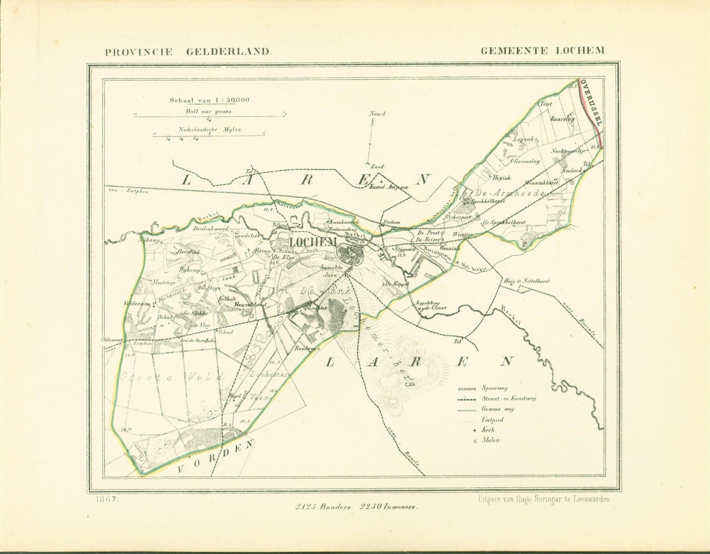 Map Kuyper Gemeente atlas van GELDERLAND This is an original map taken from an incomplete copy of the Gemeente Atlas van GELDERLAND by Jacob Kuyper ( 1821 – 1908). Issued in 1867 by Surringa Leeuwarden. All maps were printed in black. The outline border of the Municipality were coloured by hand. De Gemeente Atlas van Nederland verscheen ca. 1868 en werd uitgegeven door Hugo Suringar te Leeuwarden. Voor iedere provincie een deel. Het bevat de kaarten van alle Nederlandse gemeenten. De kaarten werden in zwart/wit gedrukt waarbij de gemeentegrenzen met de hand waren ingekleurd. De tekenaar van de kaarten, Jacob Kuyper (1821-1908) was een belangrijke pionier op het gebied van de thematische cartografie en medeoprichter van het Koninklijk Nederlands Aardrijkskundig Genootschap (KNAG). Hij stelde in de periode 1857-1880 verschillende atlassen samen. De bekendste atlas was de Gemeente-Atlas van Nederland. De kaarten voor deze atlas tekende Kuyper in de jaren 1865-1870