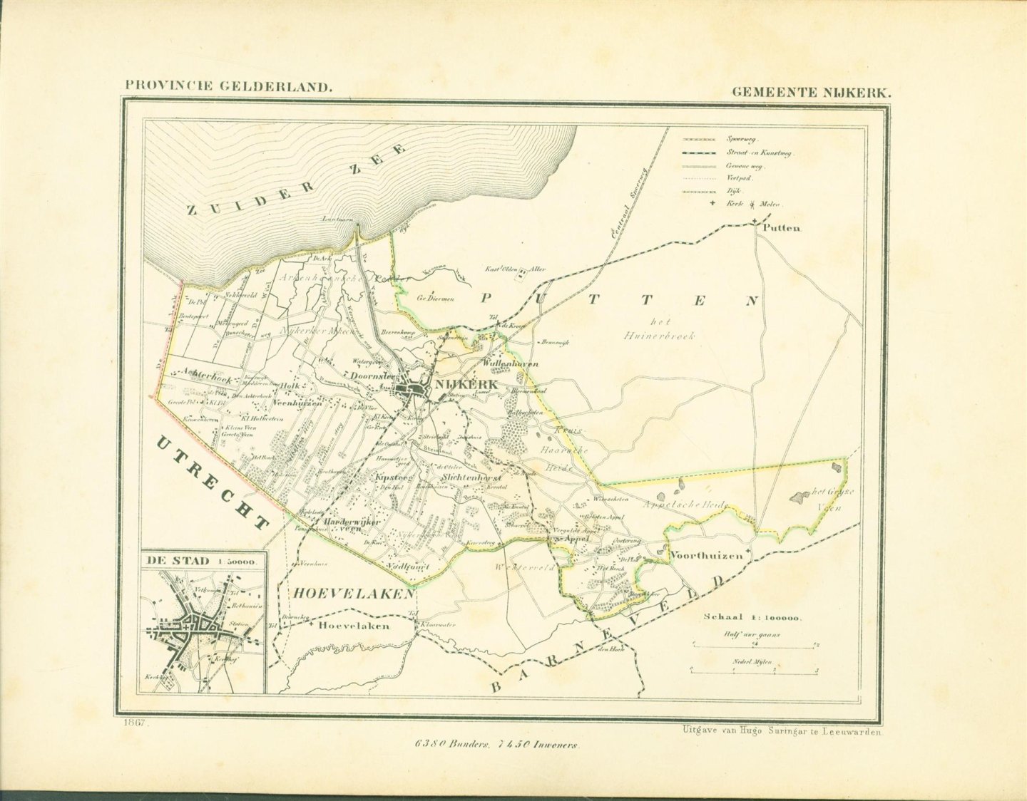 Map Kuyper Gemeente atlas van GELDERLAND This is an original map taken from an incomplete copy of the Gemeente Atlas van GELDERLAND by Jacob Kuyper ( 1821 – 1908). Issued in 1867 by Surringa Leeuwarden. All maps were printed in black. The outline border of the Municipality were coloured by hand. De Gemeente Atlas van Nederland verscheen ca. 1868 en werd uitgegeven door Hugo Suringar te Leeuwarden. Voor iedere provincie een deel. Het bevat de kaarten van alle Nederlandse gemeenten. De kaarten werden in zwart/wit gedrukt waarbij de gemeentegrenzen met de hand waren ingekleurd. De tekenaar van de kaarten, Jacob Kuyper (1821-1908) was een belangrijke pionier op het gebied van de thematische cartografie en medeoprichter van het Koninklijk Nederlands Aardrijkskundig Genootschap (KNAG). Hij stelde in de periode 1857-1880 verschillende atlassen samen. De bekendste atlas was de Gemeente-Atlas van Nederland. De kaarten voor deze atlas tekende Kuyper in de jaren 1865-1870