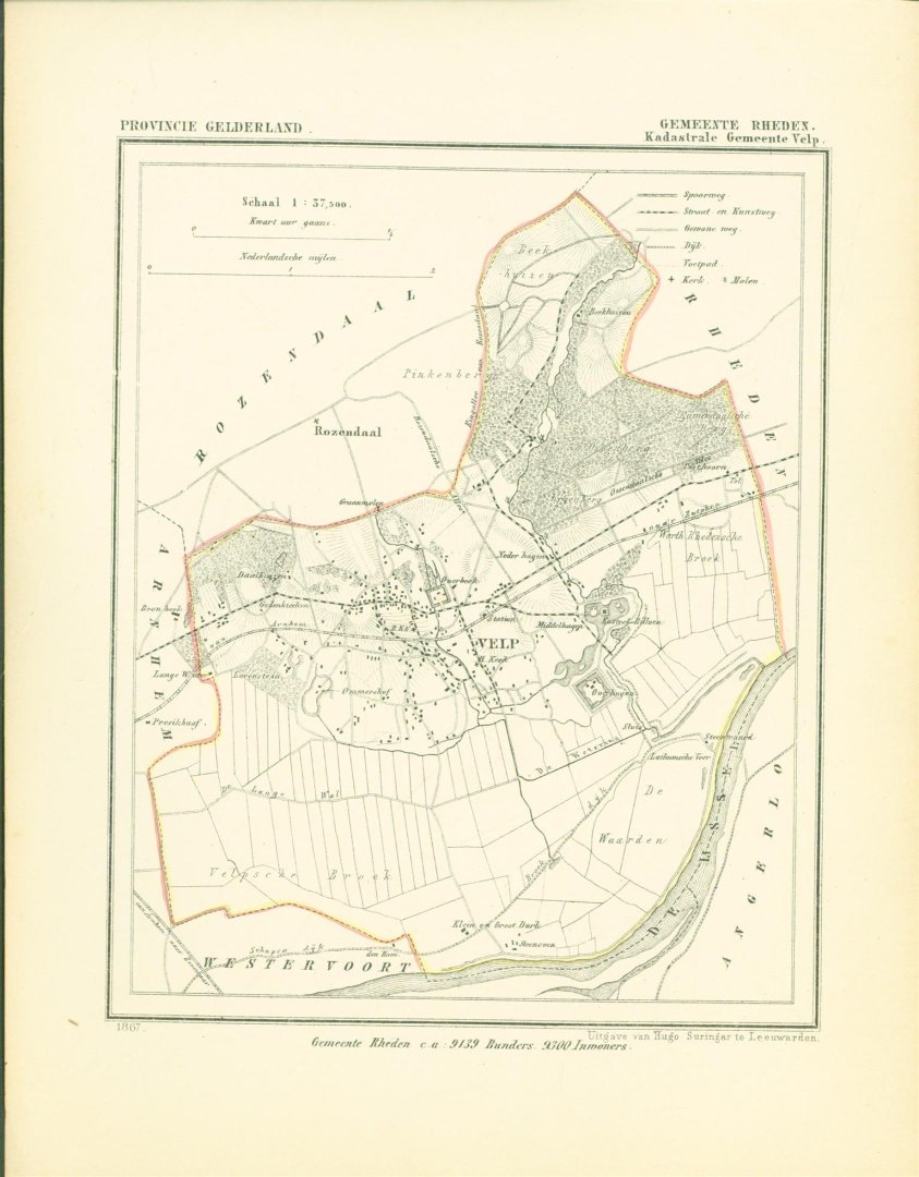 Map Kuyper Gemeente atlas van GELDERLAND This is an original map taken from an incomplete copy of the Gemeente Atlas van GELDERLAND by Jacob Kuyper ( 1821 – 1908). Issued in 1867 by Surringa Leeuwarden. All maps were printed in black. The outline border of the Municipality were coloured by hand. De Gemeente Atlas van Nederland verscheen ca. 1868 en werd uitgegeven door Hugo Suringar te Leeuwarden. Voor iedere provincie een deel. Het bevat de kaarten van alle Nederlandse gemeenten. De kaarten werden in zwart/wit gedrukt waarbij de gemeentegrenzen met de hand waren ingekleurd. De tekenaar van de kaarten, Jacob Kuyper (1821-1908) was een belangrijke pionier op het gebied van de thematische cartografie en medeoprichter van het Koninklijk Nederlands Aardrijkskundig Genootschap (KNAG). Hij stelde in de periode 1857-1880 verschillende atlassen samen. De bekendste atlas was de Gemeente-Atlas van Nederland. De kaarten voor deze atlas tekende Kuyper in de jaren 1865-1870