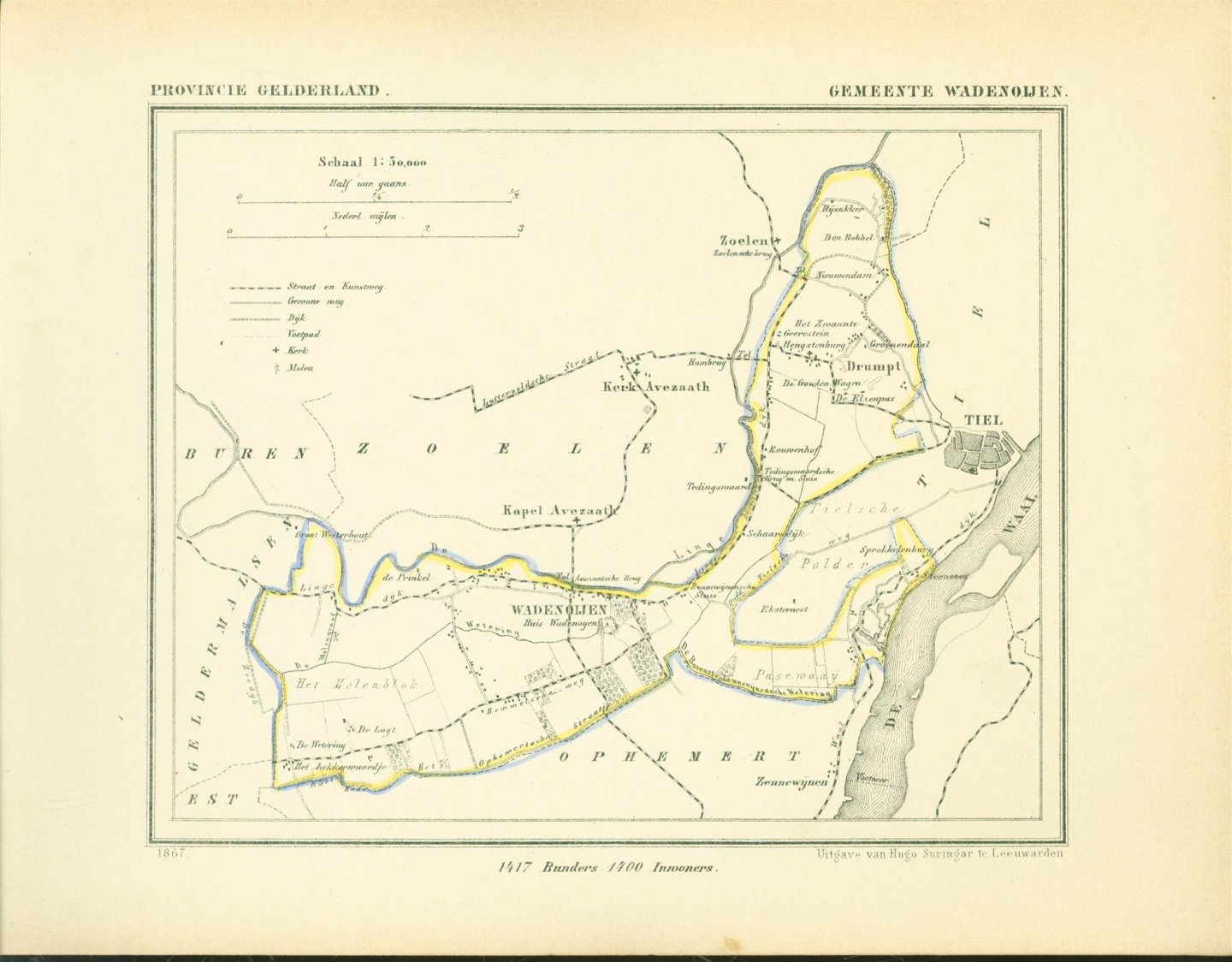 Map Kuyper Gemeente atlas van GELDERLAND This is an original map taken from an incomplete copy of the Gemeente Atlas van GELDERLAND by Jacob Kuyper ( 1821 – 1908). Issued in 1867 by Surringa Leeuwarden. All maps were printed in black. The outline border of the Municipality were coloured by hand. De Gemeente Atlas van Nederland verscheen ca. 1868 en werd uitgegeven door Hugo Suringar te Leeuwarden. Voor iedere provincie een deel. Het bevat de kaarten van alle Nederlandse gemeenten. De kaarten werden in zwart/wit gedrukt waarbij de gemeentegrenzen met de hand waren ingekleurd. De tekenaar van de kaarten, Jacob Kuyper (1821-1908) was een belangrijke pionier op het gebied van de thematische cartografie en medeoprichter van het Koninklijk Nederlands Aardrijkskundig Genootschap (KNAG). Hij stelde in de periode 1857-1880 verschillende atlassen samen. De bekendste atlas was de Gemeente-Atlas van Nederland. De kaarten voor deze atlas tekende Kuyper in de jaren 1865-1870