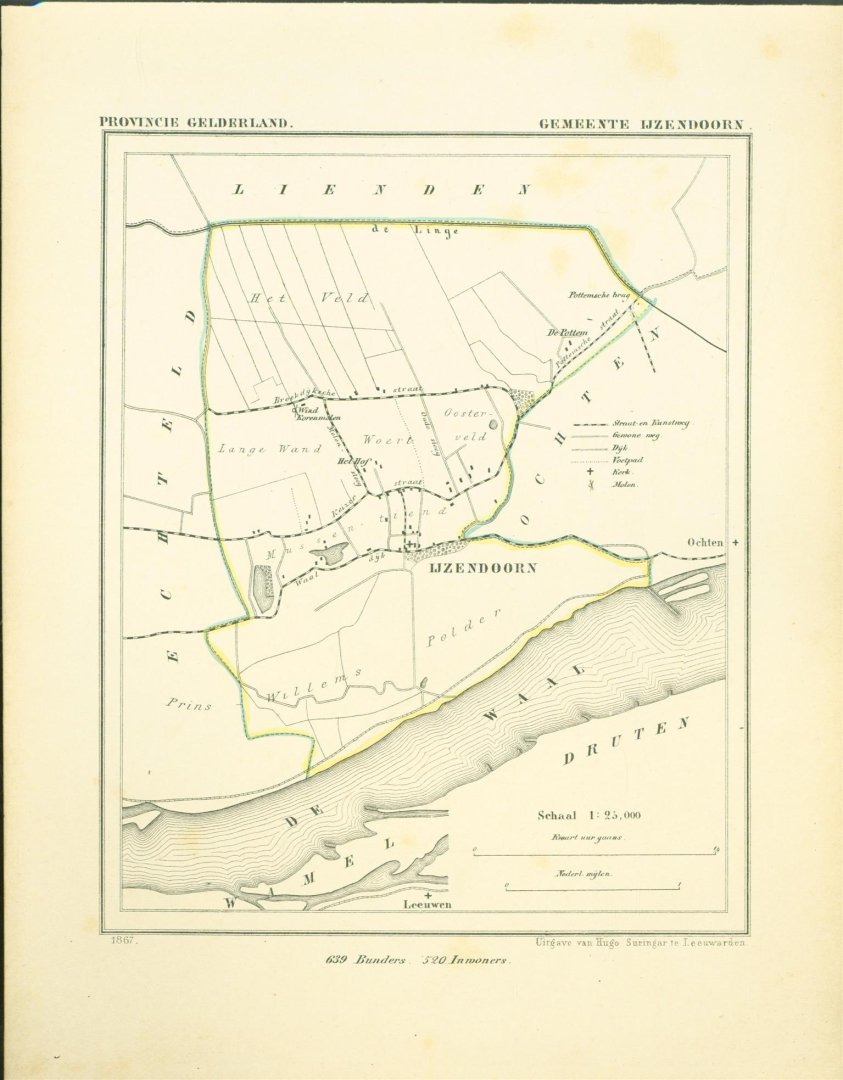 Map Kuyper Gemeente atlas van GELDERLAND This is an original map taken from an incomplete copy of the Gemeente Atlas van GELDERLAND by Jacob Kuyper ( 1821 – 1908). Issued in 1867 by Surringa Leeuwarden. All maps were printed in black. The outline border of the Municipality were coloured by hand. De Gemeente Atlas van Nederland verscheen ca. 1868 en werd uitgegeven door Hugo Suringar te Leeuwarden. Voor iedere provincie een deel. Het bevat de kaarten van alle Nederlandse gemeenten. De kaarten werden in zwart/wit gedrukt waarbij de gemeentegrenzen met de hand waren ingekleurd. De tekenaar van de kaarten, Jacob Kuyper (1821-1908) was een belangrijke pionier op het gebied van de thematische cartografie en medeoprichter van het Koninklijk Nederlands Aardrijkskundig Genootschap (KNAG). Hij stelde in de periode 1857-1880 verschillende atlassen samen. De bekendste atlas was de Gemeente-Atlas van Nederland. De kaarten voor deze atlas tekende Kuyper in de jaren 1865-1870