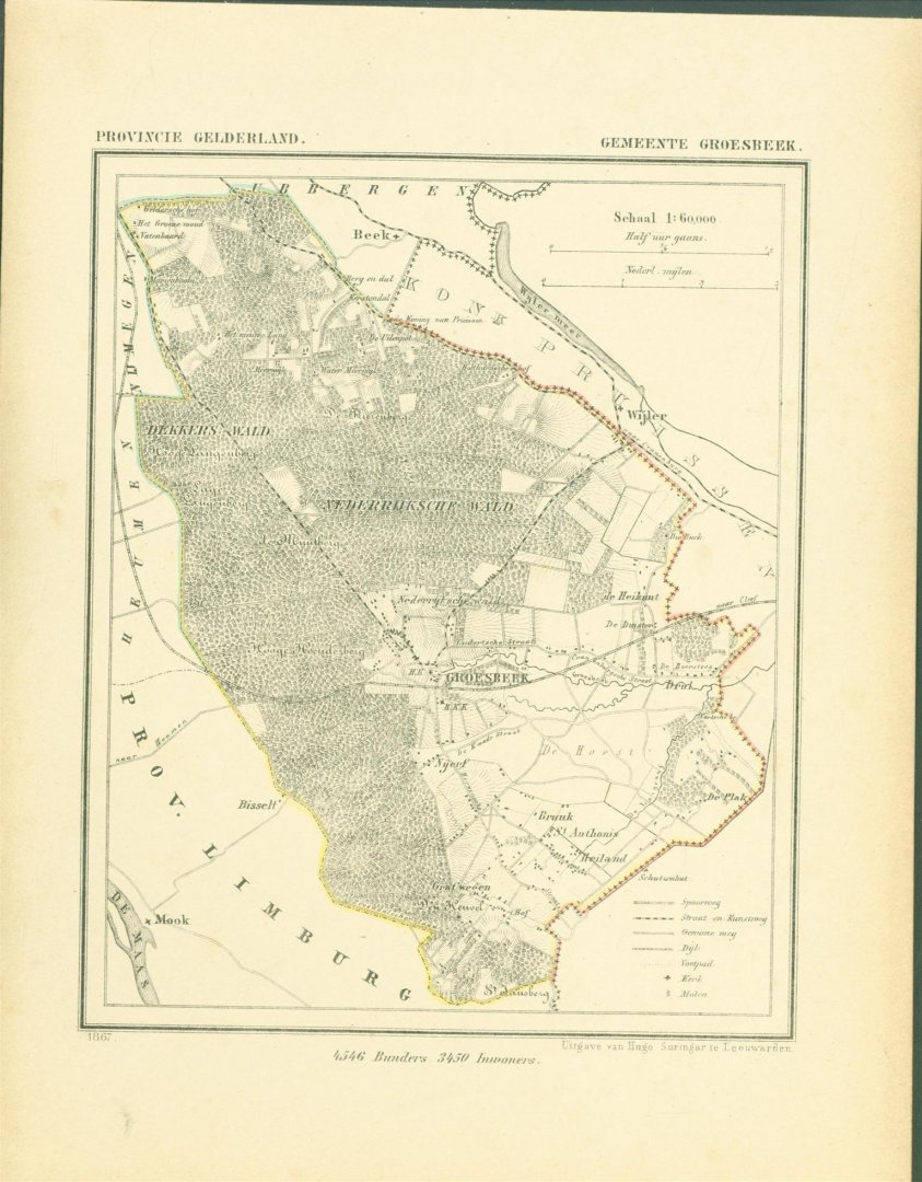 Map Kuyper Gemeente atlas van GELDERLAND This is an original map taken from an incomplete copy of the Gemeente Atlas van GELDERLAND by Jacob Kuyper ( 1821 – 1908). Issued in 1867 by Surringa Leeuwarden. All maps were printed in black. The outline border of the Municipality were coloured by hand. De Gemeente Atlas van Nederland verscheen ca. 1868 en werd uitgegeven door Hugo Suringar te Leeuwarden. Voor iedere provincie een deel. Het bevat de kaarten van alle Nederlandse gemeenten. De kaarten werden in zwart/wit gedrukt waarbij de gemeentegrenzen met de hand waren ingekleurd. De tekenaar van de kaarten, Jacob Kuyper (1821-1908) was een belangrijke pionier op het gebied van de thematische cartografie en medeoprichter van het Koninklijk Nederlands Aardrijkskundig Genootschap (KNAG). Hij stelde in de periode 1857-1880 verschillende atlassen samen. De bekendste atlas was de Gemeente-Atlas van Nederland. De kaarten voor deze atlas tekende Kuyper in de jaren 1865-1870