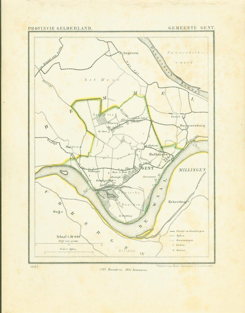 Map Kuyper Gemeente atlas van GELDERLAND This is an original map taken from an incomplete copy of the Gemeente Atlas van GELDERLAND by Jacob Kuyper ( 1821 – 1908). Issued in 1867 by Surringa Leeuwarden. All maps were printed in black. The outline border of the Municipality were coloured by hand. De Gemeente Atlas van Nederland verscheen ca. 1868 en werd uitgegeven door Hugo Suringar te Leeuwarden. Voor iedere provincie een deel. Het bevat de kaarten van alle Nederlandse gemeenten. De kaarten werden in zwart/wit gedrukt waarbij de gemeentegrenzen met de hand waren ingekleurd. De tekenaar van de kaarten, Jacob Kuyper (1821-1908) was een belangrijke pionier op het gebied van de thematische cartografie en medeoprichter van het Koninklijk Nederlands Aardrijkskundig Genootschap (KNAG). Hij stelde in de periode 1857-1880 verschillende atlassen samen. De bekendste atlas was de Gemeente-Atlas van Nederland. De kaarten voor deze atlas tekende Kuyper in de jaren 1865-1870