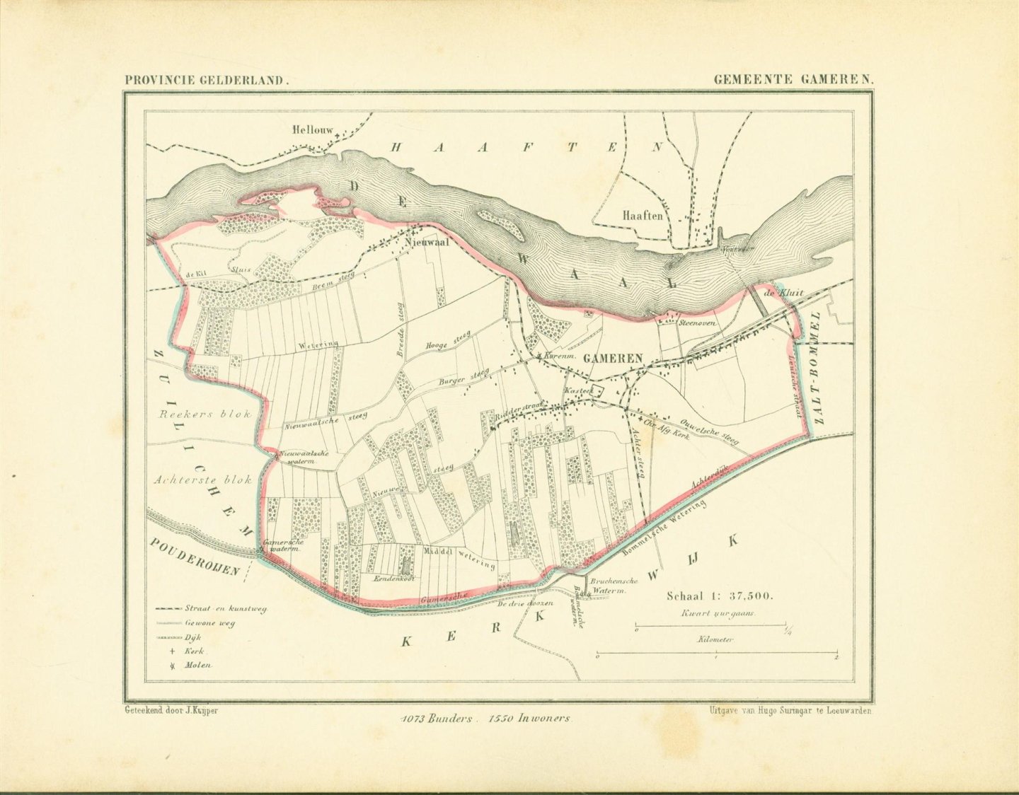 Map Kuyper Gemeente atlas van GELDERLAND This is an original map taken from an incomplete copy of the Gemeente Atlas van GELDERLAND by Jacob Kuyper ( 1821 – 1908). Issued in 1867 by Surringa Leeuwarden. All maps were printed in black. The outline border of the Municipality were coloured by hand. De Gemeente Atlas van Nederland verscheen ca. 1868 en werd uitgegeven door Hugo Suringar te Leeuwarden. Voor iedere provincie een deel. Het bevat de kaarten van alle Nederlandse gemeenten. De kaarten werden in zwart/wit gedrukt waarbij de gemeentegrenzen met de hand waren ingekleurd. De tekenaar van de kaarten, Jacob Kuyper (1821-1908) was een belangrijke pionier op het gebied van de thematische cartografie en medeoprichter van het Koninklijk Nederlands Aardrijkskundig Genootschap (KNAG). Hij stelde in de periode 1857-1880 verschillende atlassen samen. De bekendste atlas was de Gemeente-Atlas van Nederland. De kaarten voor deze atlas tekende Kuyper in de jaren 1865-1870