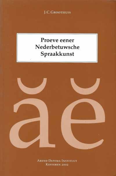 Proeve eener Nederbetuwse spraakkunst Proeve eener Nederbetuwse spraakkunst. De Maurikse hoofdonderwijzer Johannes Cornelis Groothuis beschreef het Nederbetuws heel nauwkeurig in woordenlijstjes (gepubliceerd in Onze Volkstaal) en een spraakkunst, die de redactie van dat tijdschrift helaas niet meer kon drukken omdat het tijdschrift ophield te bestaan. Met deze publicatie eert het Arend Datema-Instituut zowel Groothuis als het Proeve eener Nederbetuwse spraakkunst. (Ossenvorenreeks 70) |
