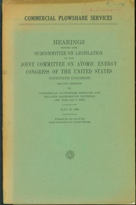 trefwoorden: Navigation.., Saint Lawrence River Navigation.., Saint Lawrence Seaway.., North America Saint Lawrence River.., North America Saint Lawrence Seaway.-- Washington DC: U. S. Government Printing Office, 1968. Presumed First Edition, First printing. Wraps. Good. iii, [1], 444 pages. Illustrations. Fold-outs. Statements of Witnesses. Additional Material Submitted in the Record. Appendixes. Ink numbers on front cover. Cover has some wear and soiling. The witnesses included Dr. Gerald Tape and Mr. Joseph Hennessey of the Atomic Energy Commission and Mr. Adrian Fisher, the Deputy Director of the Arms Control and Disarmament Agency. Project Plowshare was the overall United States program for the development of techniques to use nuclear explosives for peaceful construction purposes. As part of the program, 31 nuclear warheads were detonated in 27 separate tests. Plowshare was the US portion of what are called Peaceful Nuclear Explosions (PNE); a similar Soviet program was carried ou