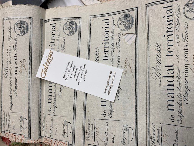 Promesse Mandat Territorial, 5 copies, nrs 7181-7185, serie 2, 500 francs, One large printed and handwritten paper, two minor holes in two promesses, 47x26cm, 1796, 5 mandats of 500 francs each, Mandats territoriaux were paper bank notes issued as currency by the French Directory in 1796 to replace the assignats which had become virtually worthless. They were land-warrants supposedly redeemable in the lands confiscated from royalty, the clergy and the church after the outbreak of the French Revolution in 1789. In February 1796, 800,000,000 francs of mandats were issued as legal tender to replace the 24,000,000,000 francs of assignats then outstanding. In all about 2,500,000,000 francs of mandats were issued. They were heavily counterfeited and their value depreciated rapidly within six months. In February 1797, they lost their legal tender quality and by May were worth virtually nothing. The mandat was only briefly in circulation. The legislation that created the mandat was passed on 18 March 1796 but rapidly fell into decline and was without real value within months. Rumors that the mandats would not be accepted and a history of hyperinflation lead many merchants to reject the mandats as they had the assignats. The new currency did little to solve the economic problems and workers were angered that new enforcement measures were not put in place to prevent discrimination between mandats and coin.
