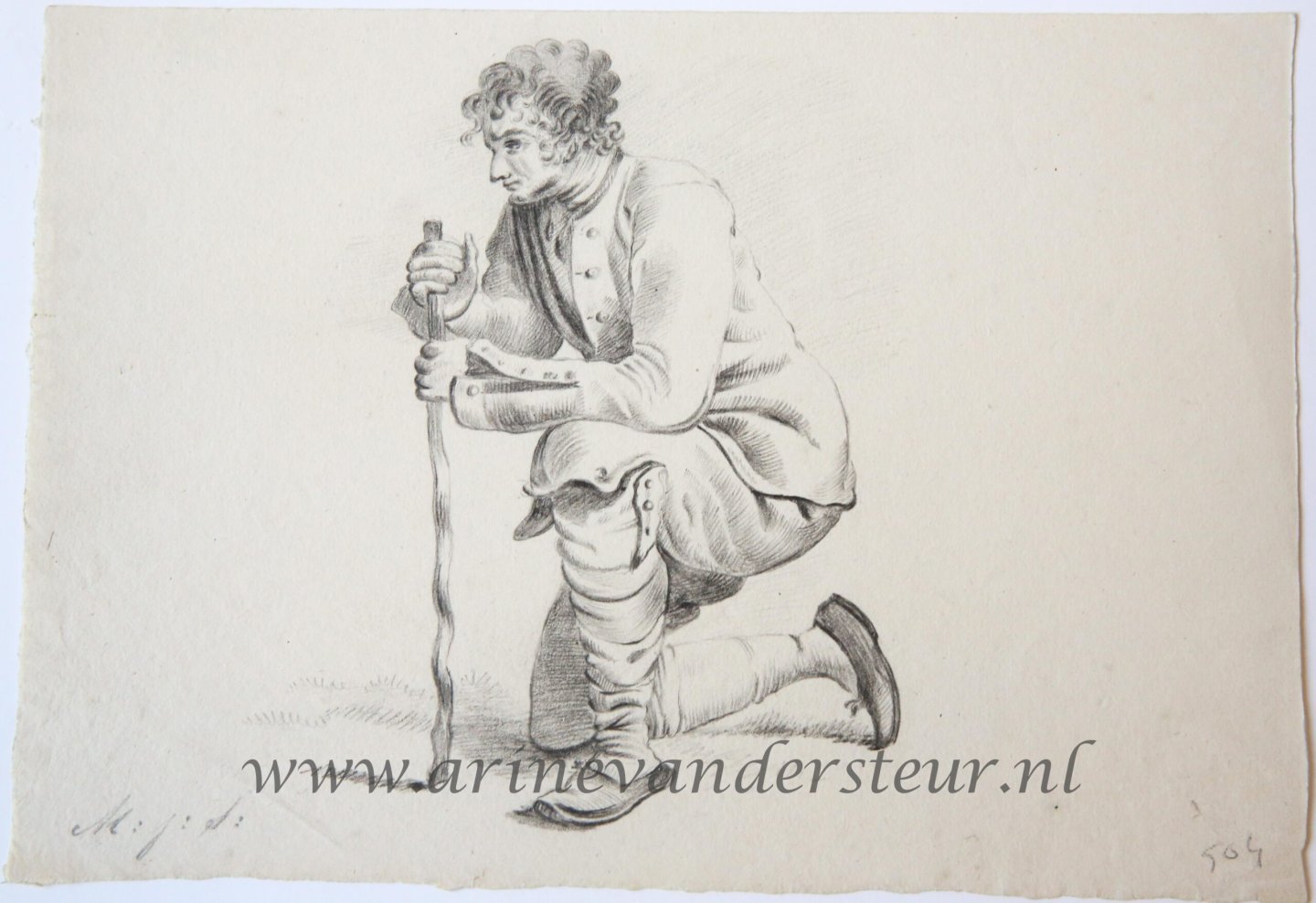 | Bijzonderheden: | Sketch of a kneeling man, resting his hands on a stick. Dressed in nineteenth-century clothes. Monogrammed on the bottom left: M.J.S. |