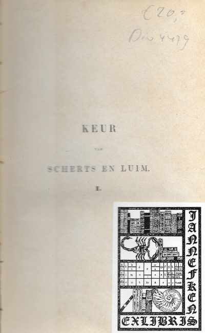 Keur van Scherts en Luim. (Eerste en Tweede deel in 1 band) Met Ex-Libris Keur van Scherts en Luim Eerste deel. Keur van Scherts en Luim uit onderscheidene Nederlandsche dichters. Verzameld door W.J. van Zeggelen. |