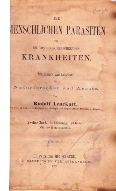 Die Menschlichen Parasieten und die von Ihnen Herrührenden Krankheiten Die Menschlichen Parasieten und die von Ihnen Herrührenden Krankheiten. Ein Hand-und Lehrbuch für Naturforscher und Aerzte. Zweiter band. 3 Lieferung (Schluss) Mit 119 Holzschnitten. sehr selten |