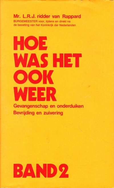 Hoe was het ook weer Band 1 en 2 Hoe was het ook weer Band 1 en 2. Dit is een boek dat niet zal nalaten stof te doen opwaaien. Van Rappard zou zich zelf niet zijn, wanneer hij bij zijn geschiedschrijving niet zijn eigen persoon in het middelpunt van de gebeurtenissen zou plaatsen. Het boek is geschreven in chronologische volgorde en begint in de vooroorlogse jaren. Een terugblik op de gezins- en familieachtergronden van de schrijver in het vooroorlogse Nederland. In september 1939 wordt hij benoemd tot burgemeester van Gorinchem. En hier maakt hij de eerste vijf oorlogsdagen mee en de verdere bezettingsjaren tot 24 februari 1943, de dag waarop hij door de SD werd gearresteerd. |