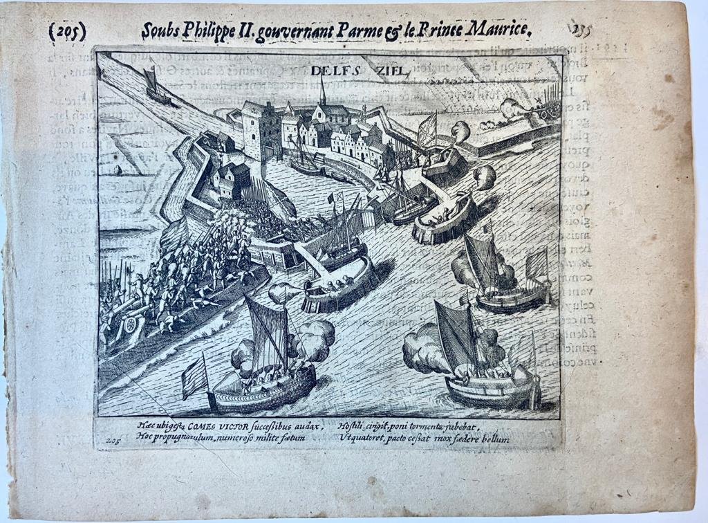 | Titel: | Copperplate etching/engraving of the siege of Delfs ziel, in the Dutch city of Delfzijl (Groningen), as it happend in 1591 |