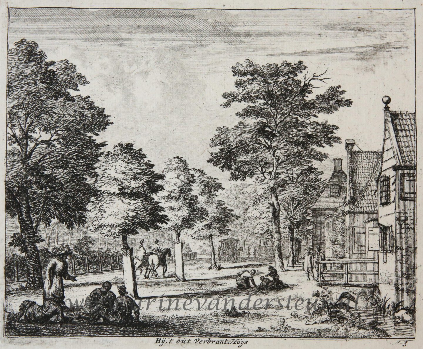 | Bijzonderheden: | Figures at the back of a house, some sitting in the shadow, other walking and riding horses towards the background.Titled at the bottom: 'Bij 't out Verbrant Huijs', numbered on the right: '3'. From a set of 12 prints: 'Gesiten buyten Haarlem'.On ... |