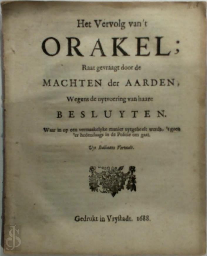 | Titel: | Het vervolg van't orakel: raat gevraagt door de machten der aarden, wegens de uytvoering van haare besluyten . |