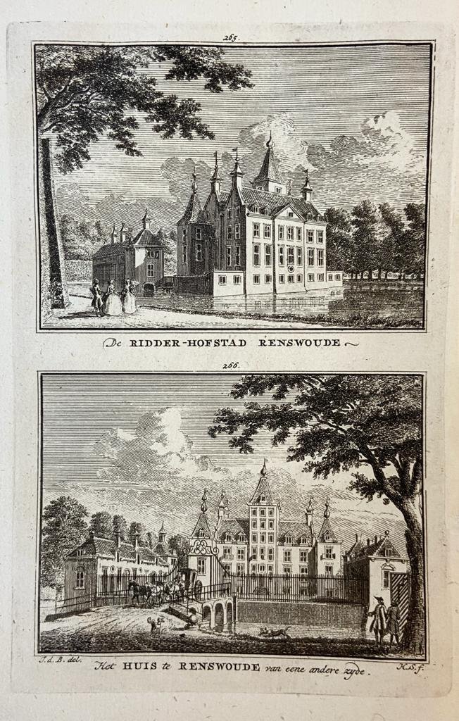 | Bijzonderheden: | Copperplate engraving/etching of 'De Ridder-Hofstad Renswoude' and 'Het Huis te Renswoude van eene andere zijde', in the Dutch province of Utrecht (1745-1774). Two images on one page. Overall size: 205 x 133 mm; plate size: 163 x 107 mm. Good stat... |