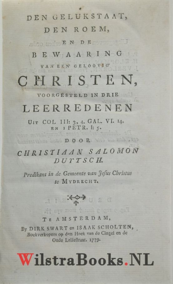 | Titel: | Den gelukstaat, den roem, en de bewaaring van een 'geloovig' Christen, voorgesteld in drie leerredenen : uit Col. III: 3,4., Gal. VI. 14. en 1 Petr. I: 5 / door Christiaan Salomon Duytsch |