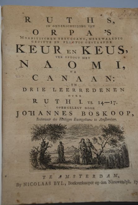 | Titel: | Ruths, in onderscheiding van Orpa's Moabitischen teruggang, merkwaardig geuitte en plegtig gestaafde keur en keus, ter optogt, met Naomi na Canaan : in drie leerredenen over Ruth I. vs. 14-17 / opengelegt door Johannes Boskoop |