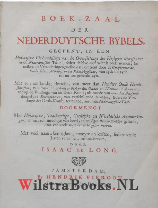 | Titel: | Boek-Zaal der Nederduytsche Bybels, geopent, in een Historische Verhandelinge van de Oversettinge der Heyligen Schriftuure in de Nederduytsche Taale, sedert deselve eerst wierdt ondernomen, beneffend de Veranderingen, welke daar omtrent door d... |